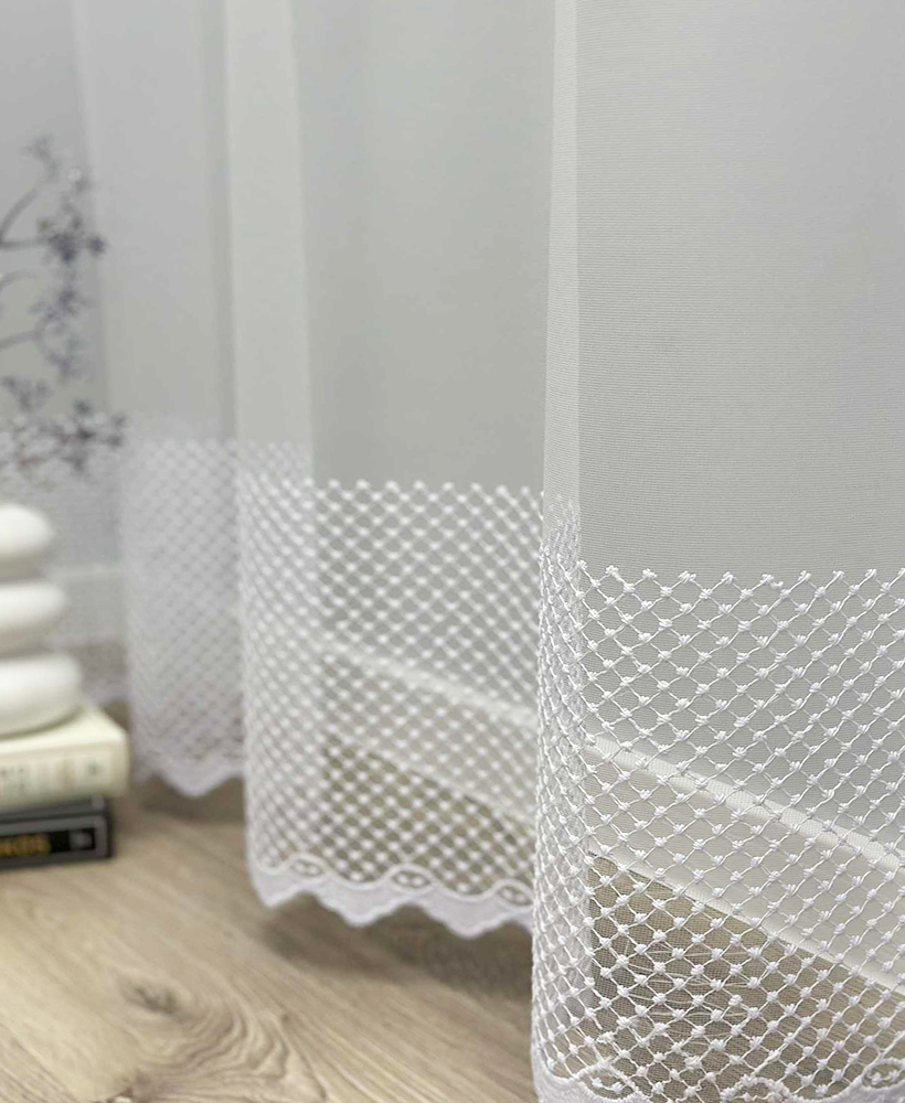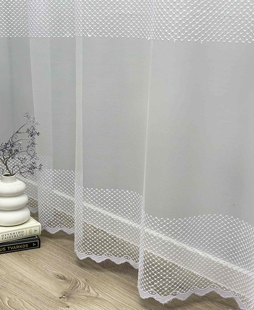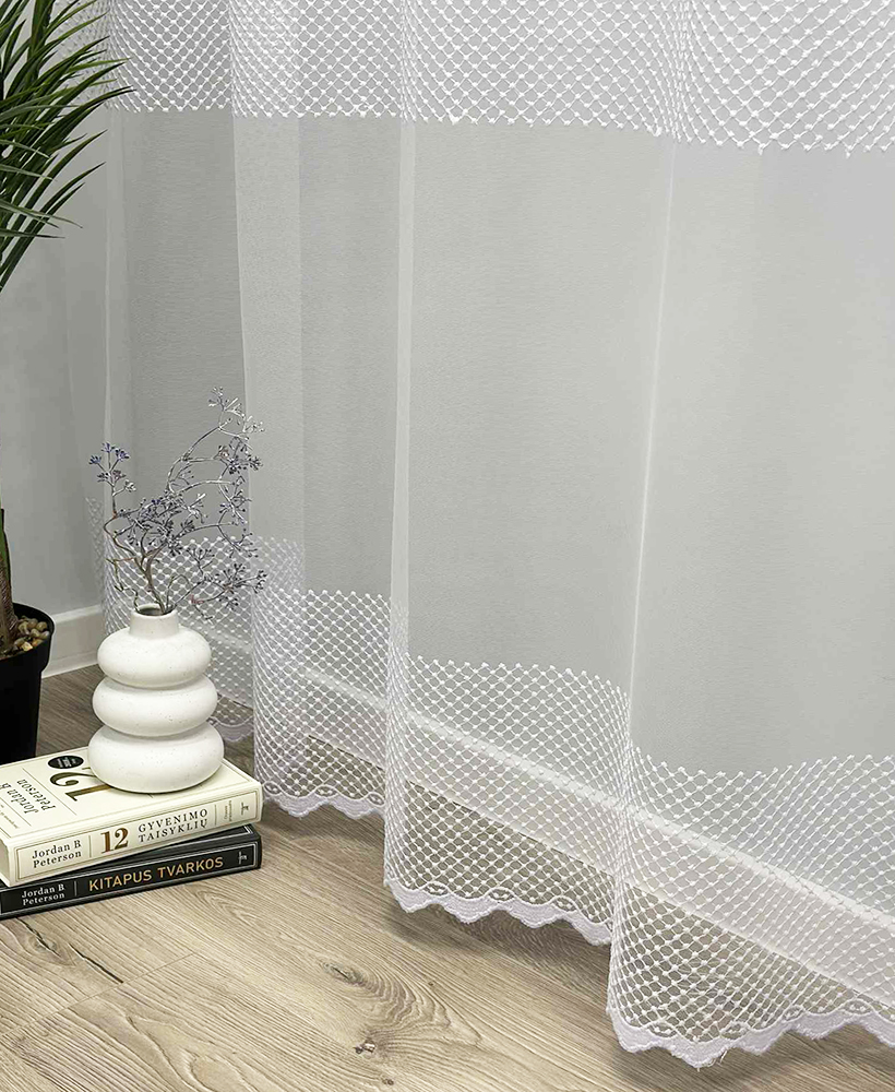 Siuvinėtas tinklelio tipo dieninių užuolaidų audinys – tai aukštos kokybės turkiškas audinys, pasižymintis subtiliu raštu, lengvumu ir elegancija. Tinklelio struktūra leidžia šviesai švelniai patekti į patalpą, suteikiant erdvės ir jaukumo pojūtį. Šis audinys puikiai tinka tiems, kurie vertina šviesų, harmoningą ir estetišką interjerą.