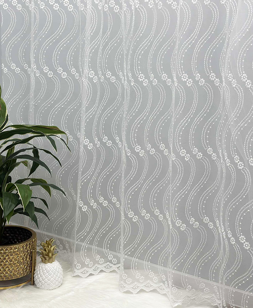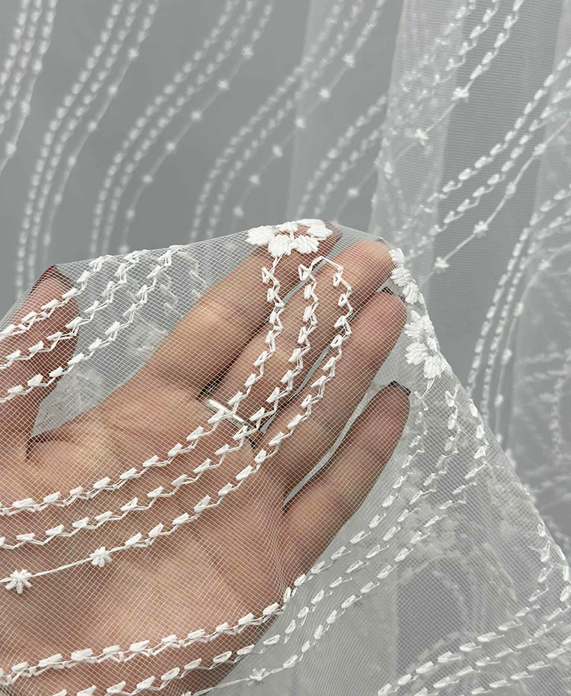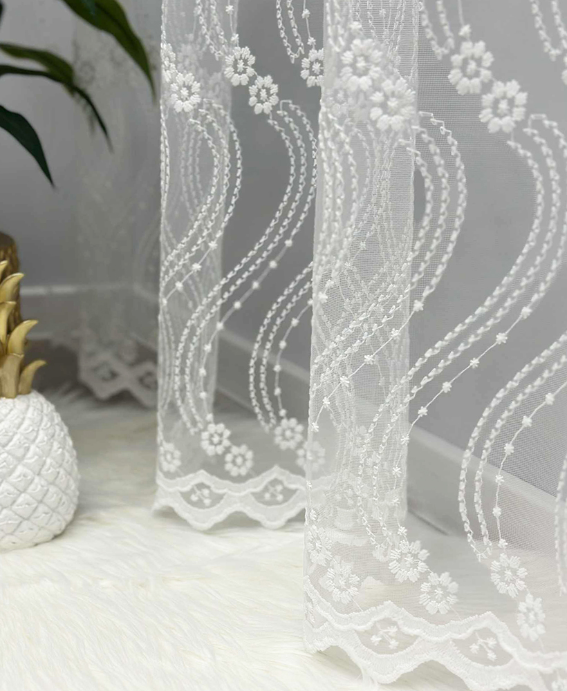 Siuvinėtas tinklelio tipo dieninių užuolaidų audinys – tai aukštos kokybės turkiškas audinys, pasižymintis subtiliu raštu, lengvumu ir elegancija. Tinklelio struktūra leidžia šviesai švelniai patekti į patalpą, suteikiant erdvės ir jaukumo pojūtį. Šis audinys puikiai tinka tiems, kurie vertina šviesų, harmoningą ir estetišką interjerą.