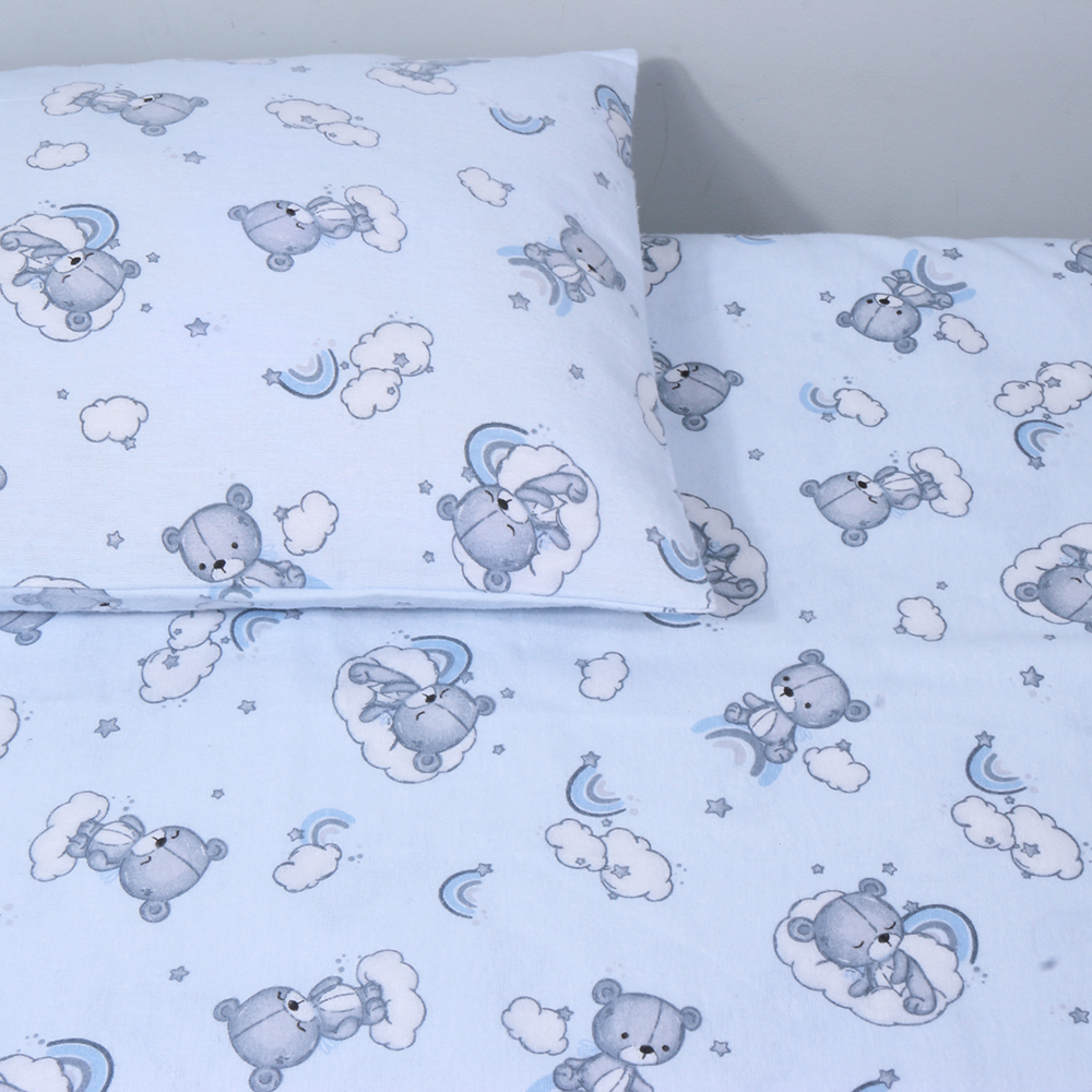 Audinys gerai sugeria drėgmę ir padeda palaikyti komfortišką pojūtį miego metu. Patalynė pagaminta iš 100 % medvilninės flanelės, atitinkančios OEKO-TEX® Standard 100 reikalavimus – tai reiškia, kad audinys patikrintas dėl kenksmingų medžiagų ir tinkamas jautriai kūdikio odelei.
