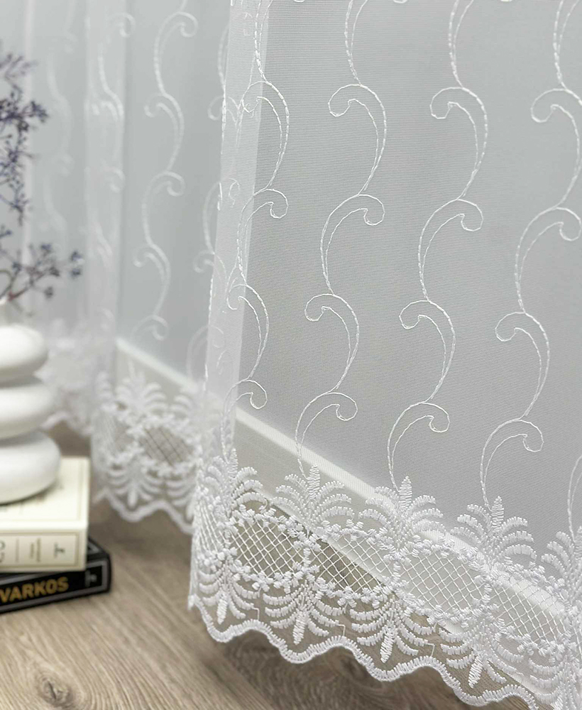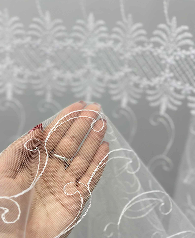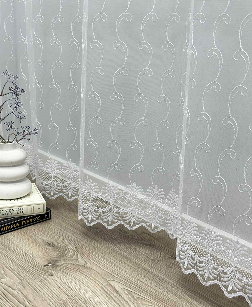 Dieninių užuolaidų audinys – siuvinėtas tinklelis