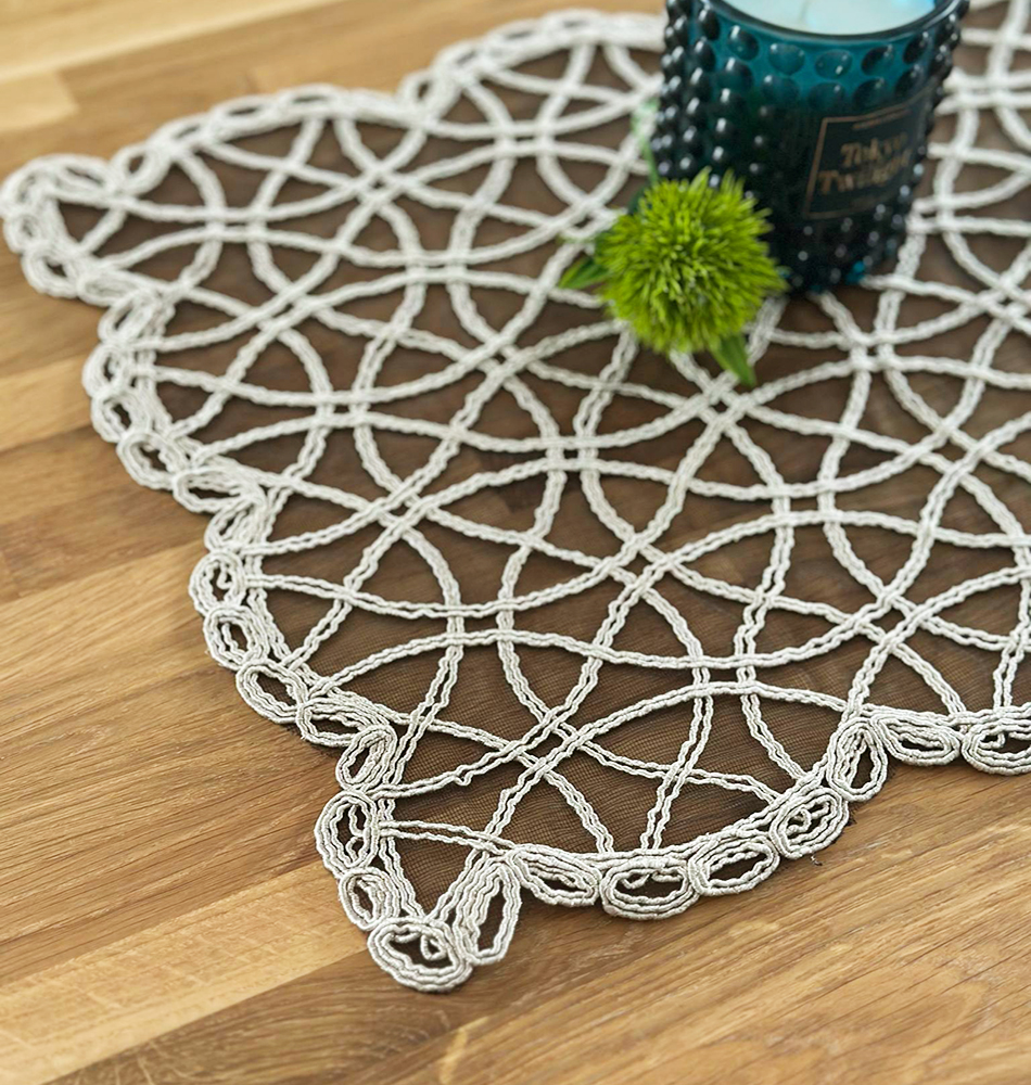 Servetėlė gali būti puošnus aksesuaras tiek virtuvės stalui, tiek žurnaliniam staliukui. Tokia detalė papuoš net ir komodą Jūsų kambaryje. Ši servetėlė, puošta kreminės spalvos sutažo nėriniais bei subtiliai dekoruota lurex siūlu.