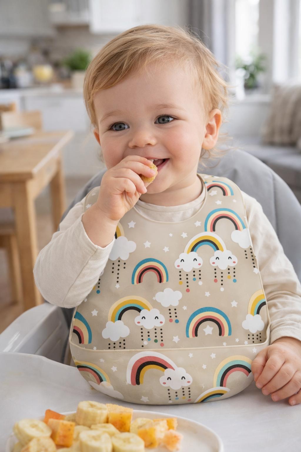 Šis neperšlampamas silikoninis seilinukas padės apsaugoti jūsų kūdikio drabužėlius valgymo metu. Minkštas ir lankstus silikonas užtikrina patogumą, o praktiška didelė kišenė sulaiko maisto likučius, kad jie nenukristų ant vaiko rūbelių ar grindų.