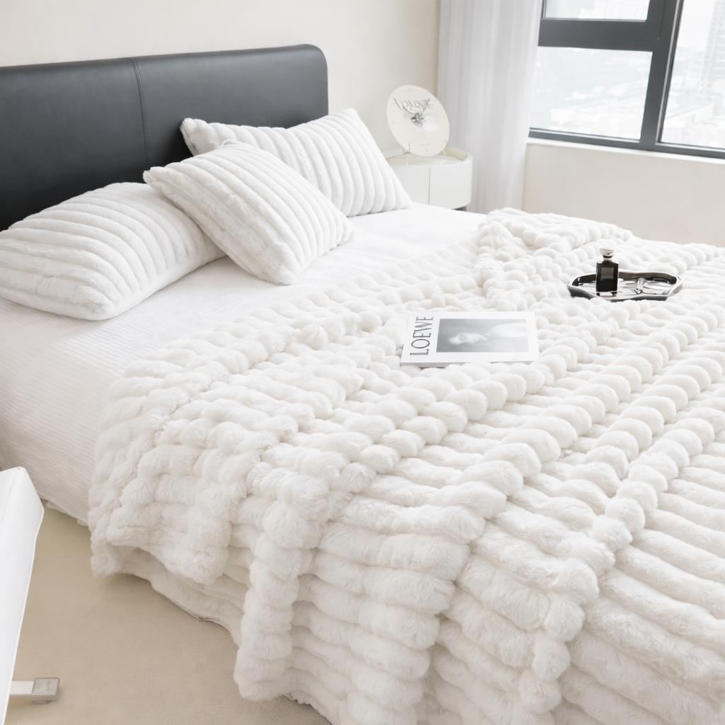 Pledas pagamintas iš itin minkštos medžiagos, kuri apgaubia kūną švelnia šiluma. Jo paviršius dekoruotas subtiliu, plačių reljefinių juostų raštu, suteikiančiu elegancijos ir modernumo. Toks šiltas pledas užtikrina puikią šilumos izoliaciją, todėl tai idealus pasirinkimas šaltiems vakarams tiek miegamajame, tiek svetainėje.