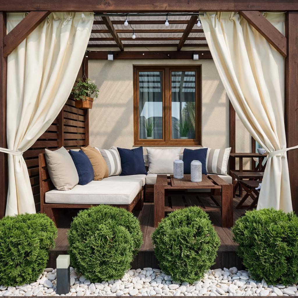 Terasa - tai ta vieta, kurioje ne tik galite pasislėpti nuo vėjo, saulės ar lietaus. Tai ir vieta šeimos bei draugų susirinkimams, ilgiems vakaro pokalbiams ar jaukioms popietėms su artimaisiais. Terasa tampa namų dalimi, lyg atskiru kambariu lauke, kuriame praleidžiate daug laiko. Tačiau kartais visgi norisi pasislėpti nuo pernelyg kaitrios saulės, o vėjuotą dieną - ir nuo vėjo gūsių. Jei turite nestiklintą, atviromis sienomis, terasą, pati geriausia išeitis - pasikabinti užuolaidas. Mūsų siuvamos užuolaidos puikiai apsaugo nuo saulės ar vėjo. Užuolaidos pasiūtos iš vandeniui atsparaus audinio, todėl jos sulaikys ir lietaus lašus. Taigi, net ir per lietų terasoje bus jauku ir malonu.